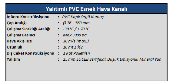 | ** Esnek Hava Kanalları orta ve düşük basınçlı ortamlarda ısıtma, soğutma, havalandırma, iklimlendirme ve atık gaz geçiş hatlarında kullanılmak üzere dizayn edilmiştir. |